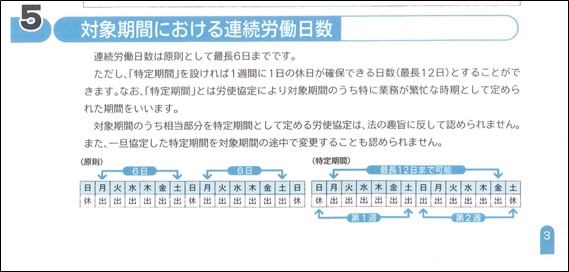 三つ目には特定期間の設定をする場合は、特に業務の繁忙な期間を特定期間として定めることができます。特定期間とは、特に業務が繁忙な時期について特定期間を協定しておけば、週に連続して労働させる日数の制限が緩和されます。(最大12日間/原則は最長週6日)。なお、特定期間は必ずしも設定する必要があるのではございません。必要があるときのみ、協定してください。(図表①)
